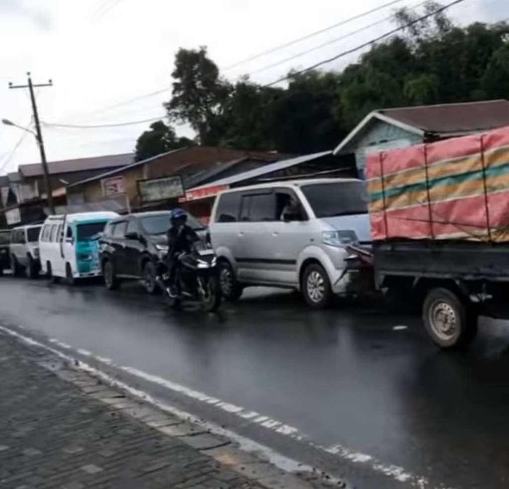 Namun, keputusan sang sopir berhenti di pinggir jalan itu menyebabkan kemacetan. Di belakang truk hijau itu terlihat kendaraan lain yang mengular.