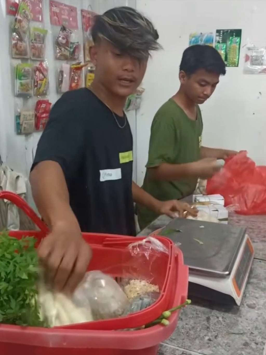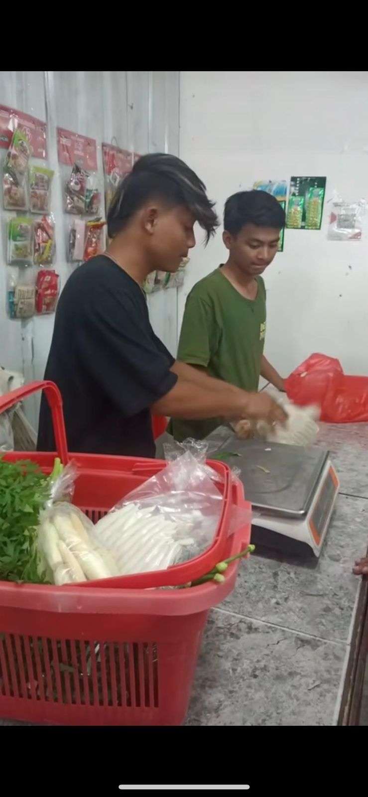 Dengan cekatan pemuda tersebut menghitung belanjaan pembeli di warungnya. Sedangkan, rekannya berkerja untuk memasukan barang belanjaan yang sudah dihitung ke sebuah wadah.