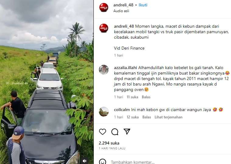 Viral di sosial media memperlihatkan puluhan mobil terjebak di tengah kebon singkong kawasan Sukabumi karena menghindari jalur macet. Video yang diunggah Instagram @andreli_48 itu memperlihatkan pengendara mobil menghindari kemacetan setelah tertutupnya arus lalu lintas akibat kecelakaan.