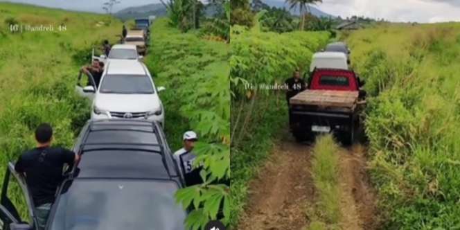 Bisa dilihat mobil-mobil tersebut tak bisa bergerak karena berada di tengah-tengah kebon singkong. Hal yang bikin miris, jalanan yang dilewati bukan jalan beraspal alias tapi jalur tanah.