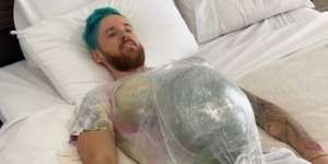 Untuk bisa bangun dari tempat tidur, si ayah yang 'hamil' ini tampak penuh perjuangan.