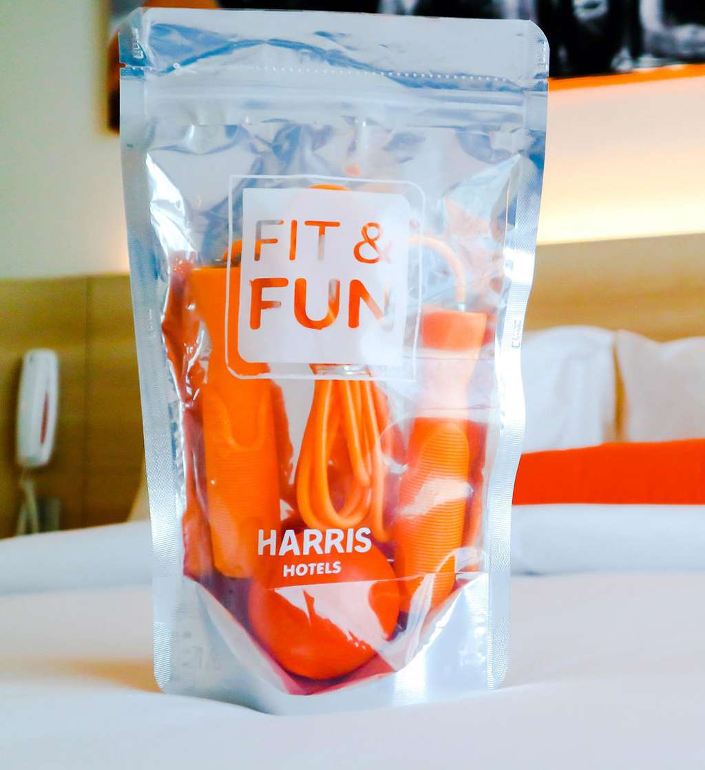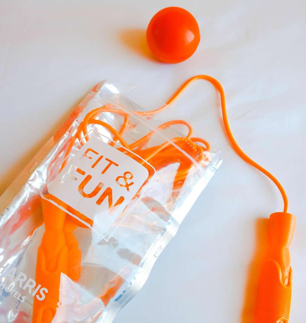 Stefao mengatakan paket Fit and Fun adalah promosi kamar khusus yang hanya tersedia di harrishotels.com atau tauziahotels.com. Isi paket ini adalah tali oranye terang dan bola peredam stres.